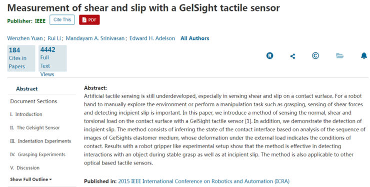 在与副导师、触觉先驱 Mandayam Srinivasan 的深度探讨中,她敏锐捕捉到解决「物体滑落」这一抓取难题的关键:将 GelSight 传感器的高维信号优势(精度较传统触觉设备提升两个数量级)与几何学结合,耗时两年最终构建出基于标记点的滑动检测模型,并发表于 ICRA 2015,师兄李瑞也参与其中。