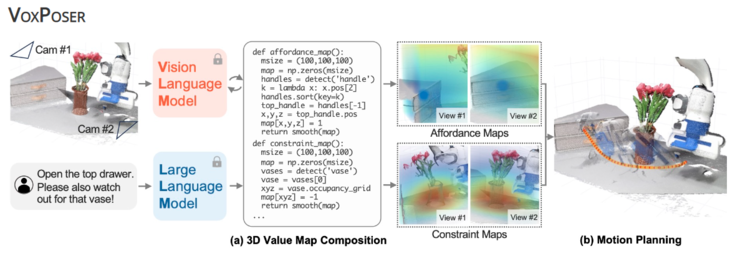 VoxPoser 将大模型接入机器人,把复杂指令转化为具体行动规划,无需额外数据与训练;还结合大语言模型同视觉语言模型,在 3D 空间中分析目标及需绕过的障碍,以零样本的方式合成轨迹为机器人规划行动。