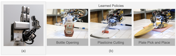 他先是作为共同一作负责学习算法的部分,在 IROS 2024 上发表了 EyeSight Hand,用模仿学习做灵巧操作,让配备了视触觉传感器的三指灵巧手能完成切橡皮泥、单手开盖等操作,这篇文章也获得IROS 2024 RoboCup最佳论文提名。随后,方浩树也开始探索硬件设计。