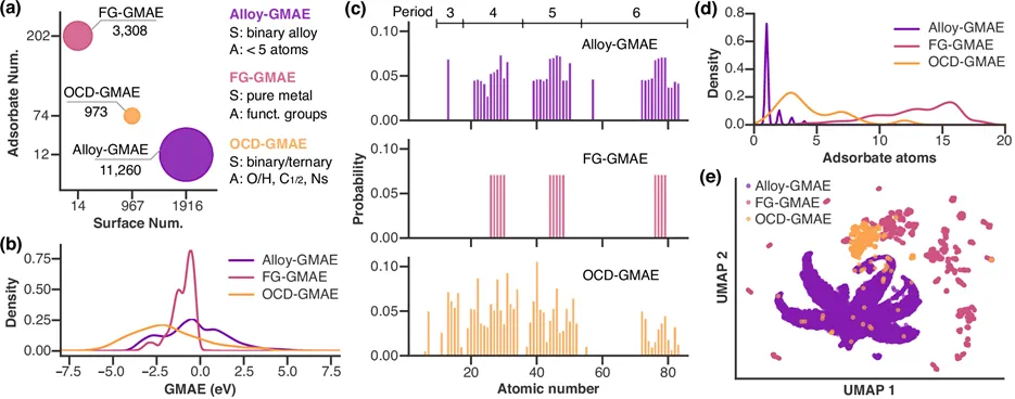为系统评估模型在不同场景下的泛化能力,研究团队构建了三个具有代表性的用于预测全局最低吸附能(GMAE)的基准数据集,分别为 OCD-GMAE、Alloy-GMAE和 FG-GMAE。每个样本对应一个唯一的催化剂表面与吸附质组合,为 AdsMT 及后续研究提供了稳定、可靠的评测基础。