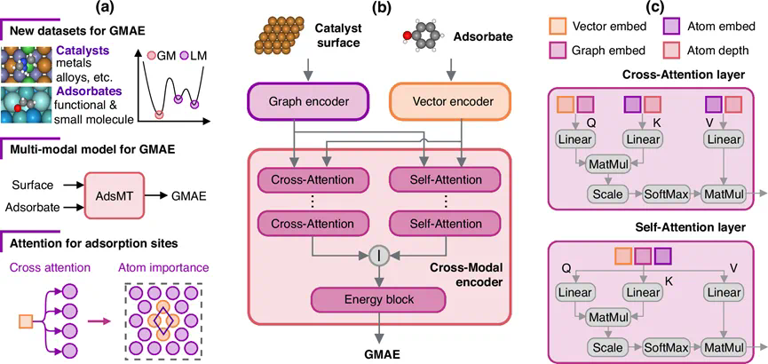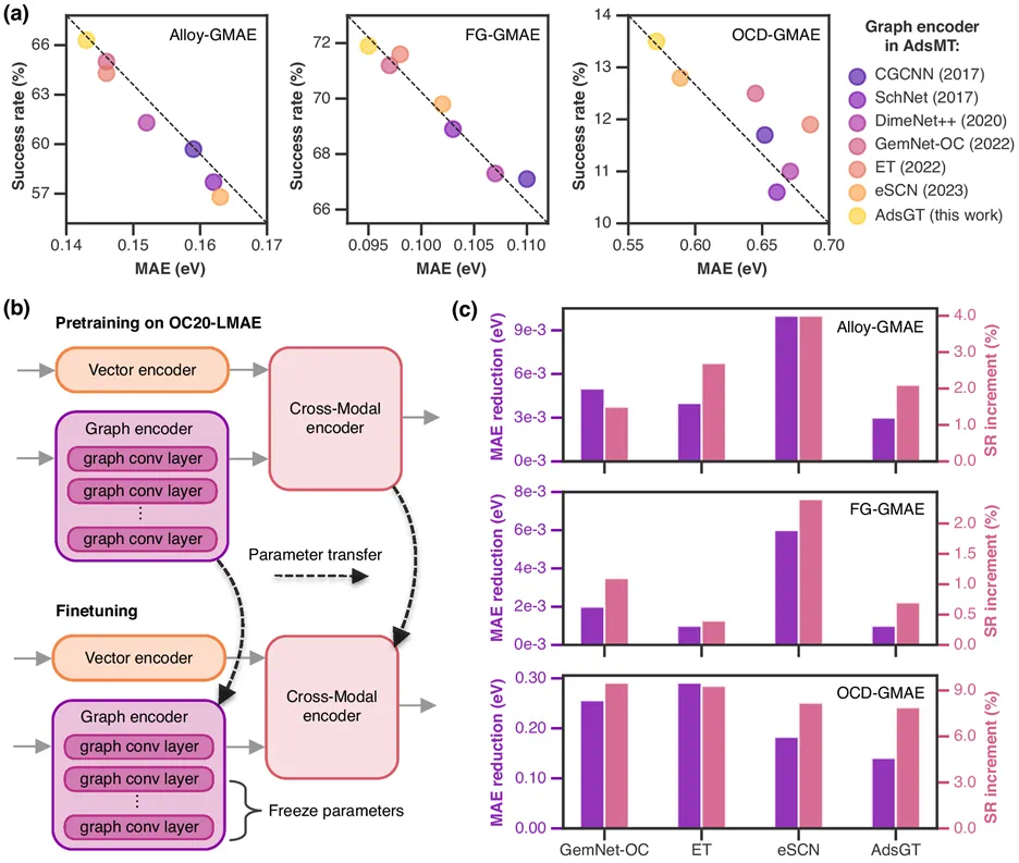 AdsMT 框架由三个模块组成:用于编码催化剂表面的图编码器、用于编码吸附质的向量编码器,以及用于融合表征并预测 GMAE 的跨模态编码器。