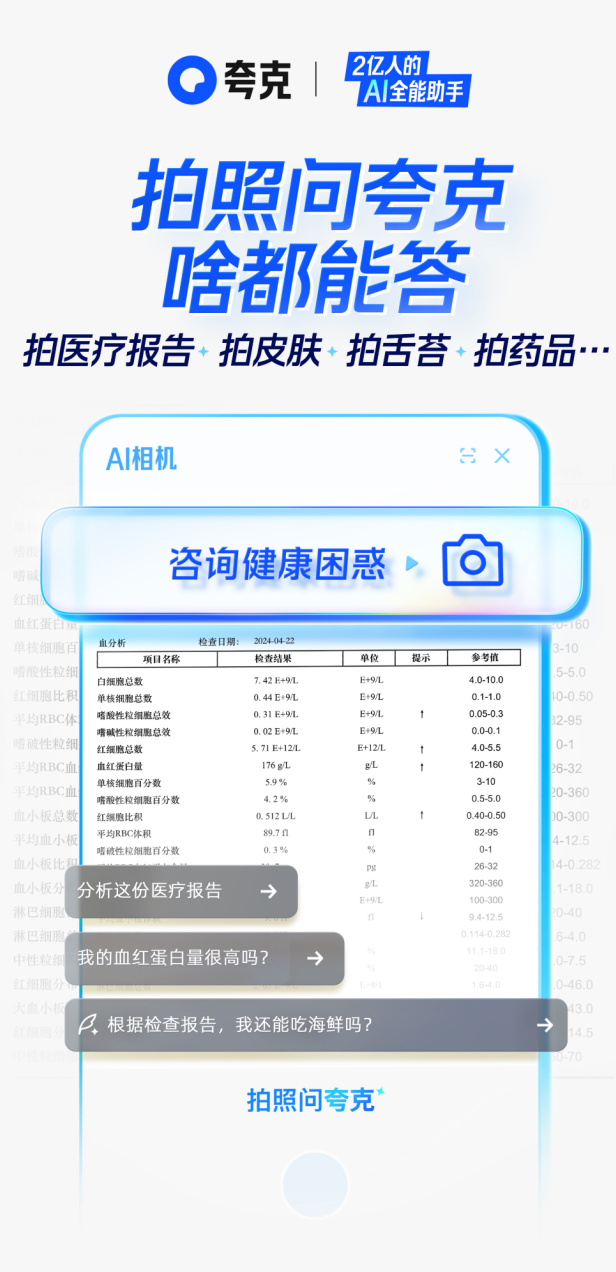 旅行中,“拍照问夸克”化身“专业导游”,边逛边拍获取文物讲解、景点攻略;工作中,它能辅助分析数据图表、优化代码逻辑,生成工作总结文档;在健康领域,上传体检报告,它给出指标异常分析以及康复方案建议。娱乐场景中,它支持棋牌指导、截图找剧、情头配对等趣味功能,并能一键完成高清化、去水印、原文溯源等。此外,“拍照问夸克”还支持多种语言提问和翻译解读。