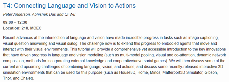 一个月后,一年一度的 NLP 领域顶会 ACL 在冬季的墨尔本召开。在火热的会场里,吴琦、Peter Anderson 和 Abhishek Das 举办了一场题为“将语言和视觉与动作联系起来” 的 tutorial,真正地开启了 VLA(视觉-语言-动作)这个全新领域。
