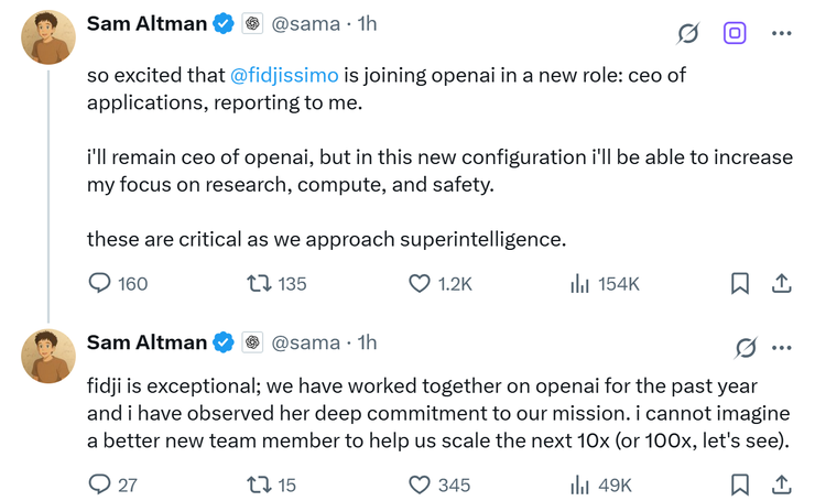 CEO Sam Altman 发文称原 Instacart 的 CEO Fidji Simo 将加入 OpenAI,担任“应用业务首席执行官”的职位(CEO of Applications),而他自己则是去守住 OpenAI 的核心技术和长期战略这块内容。