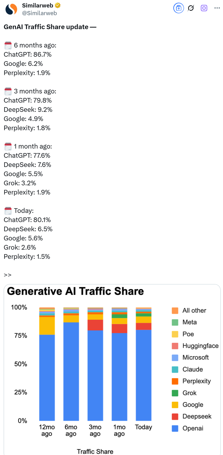 根据 Similarweb 的最新数据,OpenAI 的官网访问量在 2025 年 4 月达到了 7 亿人次,比上个月涨了 25%,但同时 Google 的 Gemini 增长了 37%,Anthropic 的 Claude 更夸张,涨了 161%。