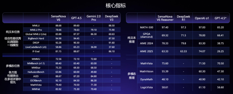 在 12 月那版融合模型的基础上,商汤继续 Scale Up,实现了新一代原生融合多模态大模型 SenseNova V6,参数规模 6000 亿,且根据官方评测数据披露,V6 不仅在综合多模态任务上对标 GPT-4.5 与 Gemini 2.0 Pro,且在纯文本任务上也能比拟 DeepSeek V3(看下图左表)、推理能力比拟 GPT-o1(下图右表):