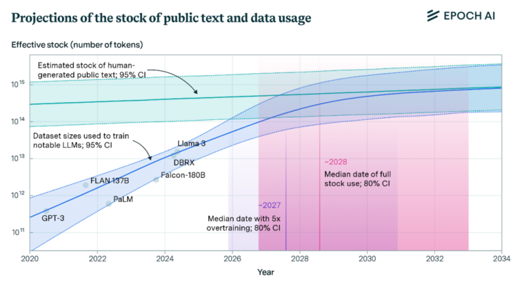且不说 DeepSeek 的目标是 AGI、下一代基础模型未必只卷语言,单从数据源来看,根据权威研究机构 EPOCH AI 的调查(如下图),用于训练大语言模型的文本数据正在迅速接近危机点;据预测,到 2028 年,语言大模型的训练数据集将用完互联网的所有可用文本数量。
