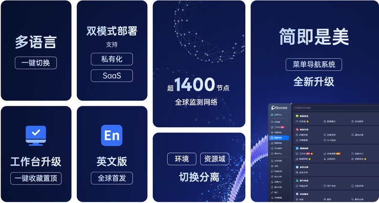 博睿数据在中国应用性能管理及可观测性APMO市场长期保持领先的基础上,此次Bonree ONE 2025春季版正式推出国际化版本,支持中英文切换,适配海外用户需求;导航栏、工作台全面优化,重构交互逻辑与界面设计,为全球用户带来更便捷、更丝滑的观测体验。