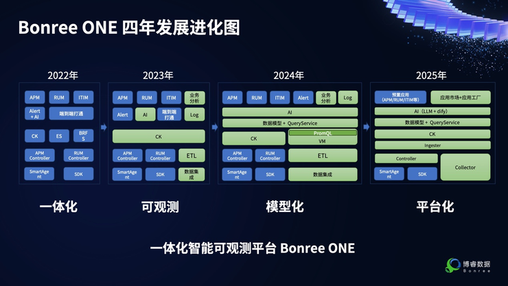 博睿数据2021 年正式迈入可观测性领域,首次提出“All in ONE”战略,逐步构建了Bonree ONE 一体化智能可观测平台并持续迭代,平台经历一体化——可观测 ——模型化——平台化四个发展阶段,构建了完整的可观测性能力图谱,实现了从单一监测工具向全场景解决方案的跨越。