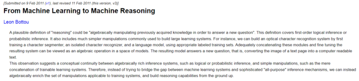 武威:对。根据我自己看的文献,「推理」的定义最早能够追溯到 2011 年。那一年,机器学习大佬 Leon Bottou 写了一篇文章,叫「From Machine Learning to Machine Reasoning」。当时业内对「Reasoning」还没有一个清晰的定义,Leon Bottou 就在这篇文章说,他认为「Reasoning」(推理)是「代数地操作已有的知识去解决新的问题」。