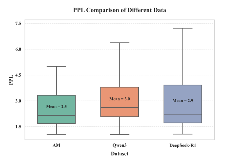 研究称,AM 的平均Perplexity(PPL)数值为2.5,低于Qwen3.0和DeepSeek R1 2.9,表明 AM 的数据在语言流畅性、连贯性等方面更优,这或许代表其适合用于训练结构化 reasoning 过程。