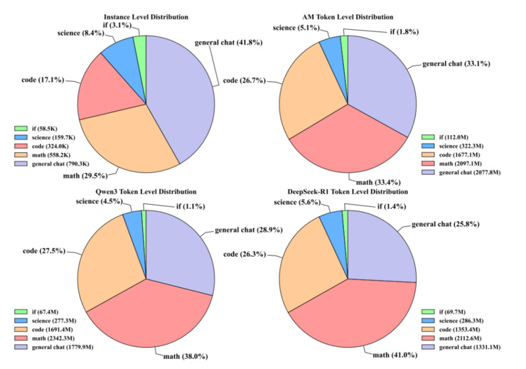 a-m-team 近期开源了一套基于 AM-Thinking-v1 和 Qwen3-235B-A22B 两个顶尖大模型生成的推理蒸馏数据集。通过对 189 万条高质量推理任务的并行蒸馏对比分析发现: