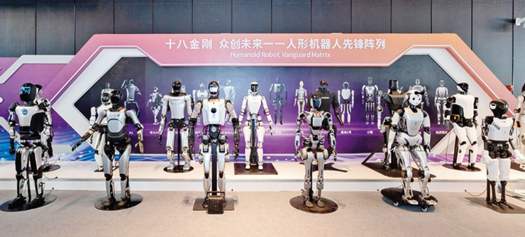 假如把时间倒转回仅仅 10 个月前:2024 年 7 月,上海世界人工智能大会,一条长长走廊的中间有一个红底白字紫色主图的展台,台前并排放着两列共计 18 个造型各异的人形机器人。主办方给这十八个机器人取名为“十八金刚”,称其为“人形机器人先锋阵列”。