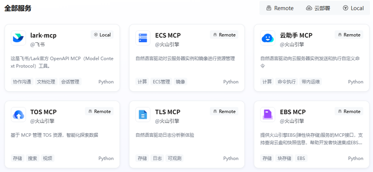 针对传统开发工具难以满足 Agent 全生命周期管理需求的难题,火山引擎以 MCP 为标准,构建端到端智能体生产体系。具体来看,火山 MCP 不仅全面覆盖办公、搜索、内容等大模型工具生态,还打通了 TRAE、火山方舟、扣子空间等一系列 Agent 开发体系,用户可以一键选择 200+ MCP 服务,快速打造出一站式端到端完整链路极速体验,高效构建复杂 Agent 并直接部署发布。