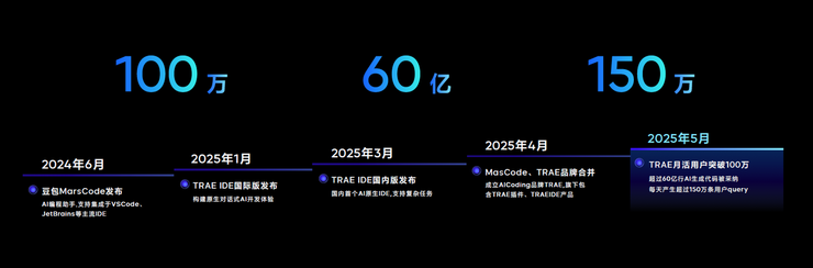 从今年 1 月上线至今, TRAE 月活用户已经超过了 100 万,累计生成超 60 亿行被用户接受的代码,实现 AI Coding 在程序员群体中的落地。