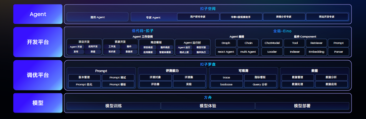 事实上,字节旗下扣子平台为了适配端到端智能体生产体系的发展,已经由原先的 Agent 低代码开发平台升级成为覆盖 Agent 低代码开发、全代码开发,Agent 调优和 Agent 协作的全生命周期平台。