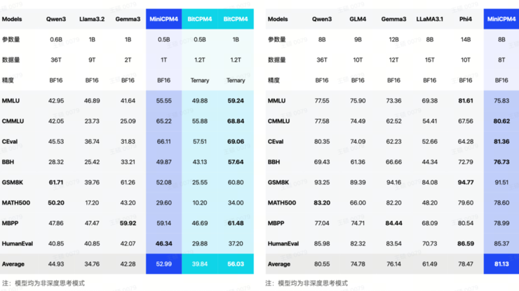 面壁此次发布的MiniCPM 4.0 也在层数上做了优化,在保持能力领先的同时,缩减了层数。MiniCPM 3.0-4B的层数达到了62层,而此次MiniCPM4.0-8B仅为 32 层、同期Qwen的同级别模型为36 层。