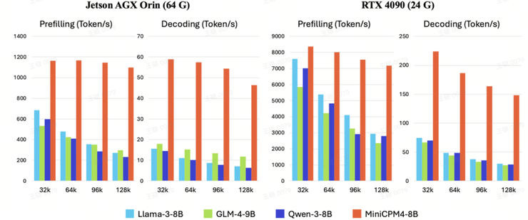 尤其在主打边缘计算的Jetson AGX orin芯片中(图左),MiniCPM4.0几乎实现了断代领先。而且在不同规模测试下,相比于同类型的模型而言,MiniCPM4.0 的响应速度的衰减比例也明显更低。这从侧面体现了面壁团队很深入的端侧优化能力。
