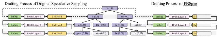 其中FR-Spec 轻量投机采样类似于小模型给大模型当“实习生”,并给小模型进行词表减负、计算加速。通过创新的词表裁剪策略,让小模型专注于高频基础词汇的草稿生成,避免在低频高难度词汇上浪费算力,再由大模型进行验证和纠正。仅CPM.cu框架让模型实现了5倍的速度提升。