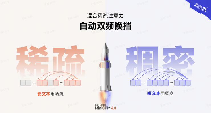 在处理高难度的长本文、深度思考任务时,启用稀疏注意力以降低计算复杂度,而在短文本场景下切换至稠密注意力以确保精度与速度,实现了长、短文本切换的高效响应。这种「高效双频换挡」机制,类似混合稀疏注意力的模式设计,让MiniCPM4.0能够拥有灵活的能力。