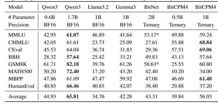 BitCPM 量化算法,实现了业界SOTA级别的 4-bit 量化,并成功探索了 3 值量化(1.58bit)方案。通过精细的混合精度策略和自适应量化算法,模型在瘦身 90%后,仍能保持出色的性能表现。在优化后,CPM4 1B的分数远超Llama3.2和Gemma3同规模的表现,仅稍逊于Qwen3 1.7B的表现。