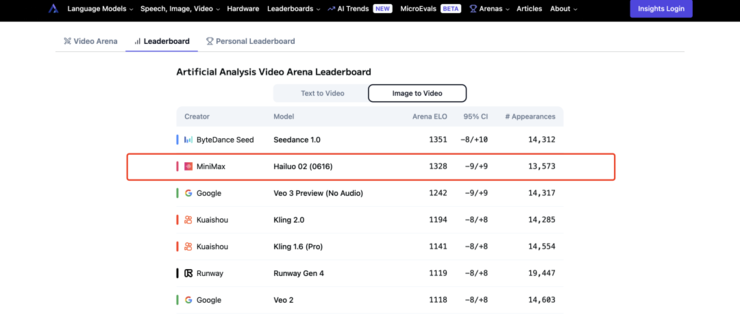 Artificial Analysis视频模型评测榜显示,Hailuo 02视频模型甫一推出,其ELO得分大幅度超过谷歌 Veo 3 和快手的 Kling 2.0,成为了全球排名第二的视频生成模型。