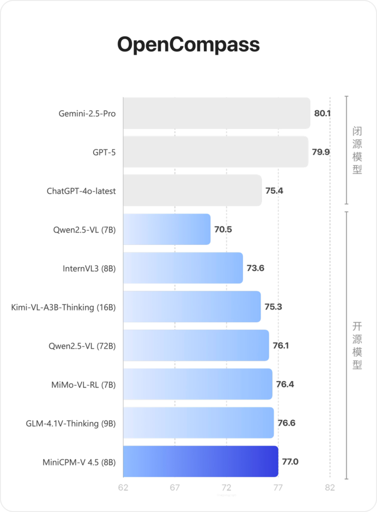 图片理解性能上,MiniCPM-V 4.5 在 OpenCompass 测评中,领先 GPT-4o、GPT-4.1、Gemini-2.0-Pro 等众多闭源模型 ,甚至超过 Qwen2.5-VL 72B,实现越级领先。