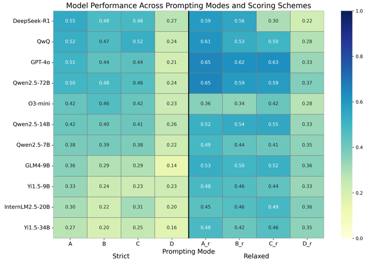 在模型选择上,研究团队既考虑了主流的通用型模型,如 Qwen2.5 系列、Yi1.5、GLM4、InternLM、GPT-4o,也纳入了专门强化推理能力的增强型模型,包括 DeepSeek-R1、QwQ、O3-mini。此外,还用 BERT 作为基线参照。所有模型一律在零样本条件下测试,不额外训练,也不给提示工程上的特殊照顾,以保证结果的可比性。