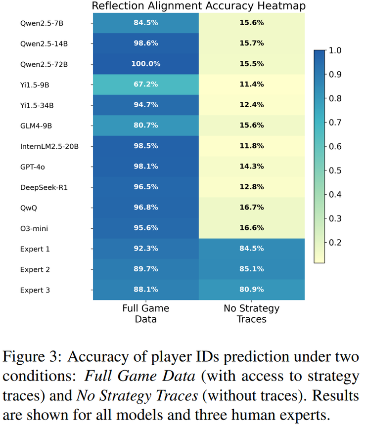 在“反思对齐”任务中,研究人员要求模型根据赛后的反思总结来推断玩家身份。最后的结果显示,当有完整的策略轨迹时,模型的表现会显著提升,因为轨迹能为它们提供清晰的锚点,把反思对应到具体的回合。但一旦失去这些轨迹,准确率就会大幅下滑,大多数模型都陷入混乱,立刻失去方向。