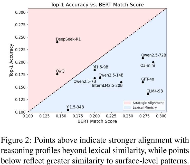 在一众表现平平的模型中,DeepSeek-R1 显得格外突出。它的 Top-1 准确率达到 0.240,是所有模型里的最高值,说明它并不是靠简单的词汇匹配来凑答案,而是真正在尝试理解并对比不同的推理风格。更有意思的是,在 BERT Match 指标上,它的得分只有 0.144,远低于大多数模型。多数模型的表现都集中在对角线附近,意味着只是停留在“表层模仿”,而 DeepSeek-R1 却明显跳脱出这一带,呈现出了一种更接近“战略对齐”的推理倾向。