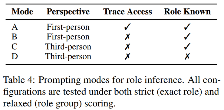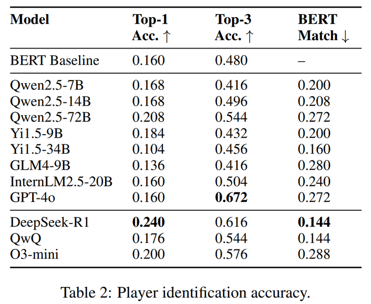 最终的结果显示,在最宽松的条件下(第一人称叙述、提供策略轨迹并已知部分身份),模型的准确率最高,但一旦去掉轨迹或身份信息,表现就会迅速下滑。尤其是在需要逐一推断身份的严格模式中,大多数模型仍然力不从心。