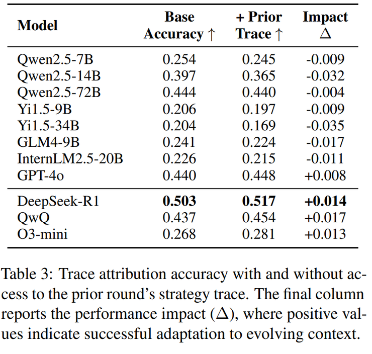最终的结果却有点出人意料,大多数模型非但没能借助前一轮信息,反而在上下文越多时表现越差,说明它们并不会真正的动态推理,而是把每个回合都当作孤立问题。但 DeepSeek-R1 是为数不多的例外,准确率从 0.503 提升到 0.517,哪怕进步有限,也证明它确实在利用历史信息。反观 GPT-4o,成绩几乎停滞,仅从 0.440 微升到 0.448,几乎没有适应性可言。