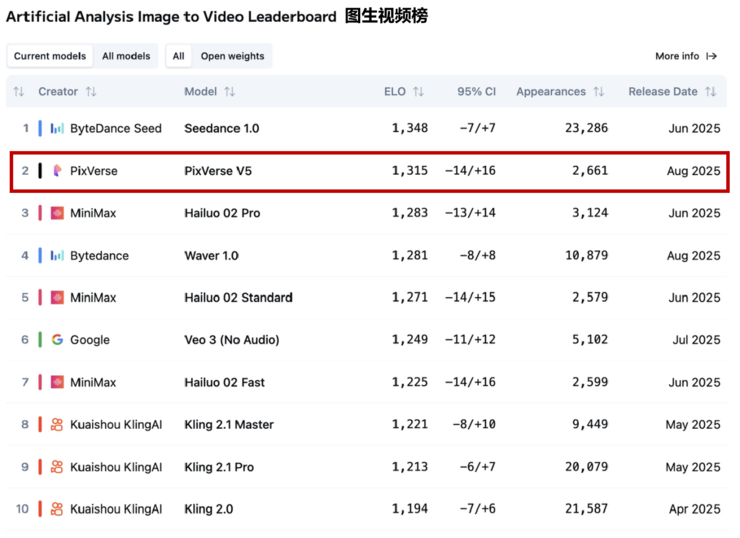 8月27日晚,根据权威独立测评平台 Artificial Analysis 最新测试结果,爱诗科技发布的PixVerse V5 新一代自研视频生成大模型,在图生视频(Image to Video)项目中排名全球 Top2,在文生视频(Text to Video)项目中位列 Top3,保持在全球第一梯队。