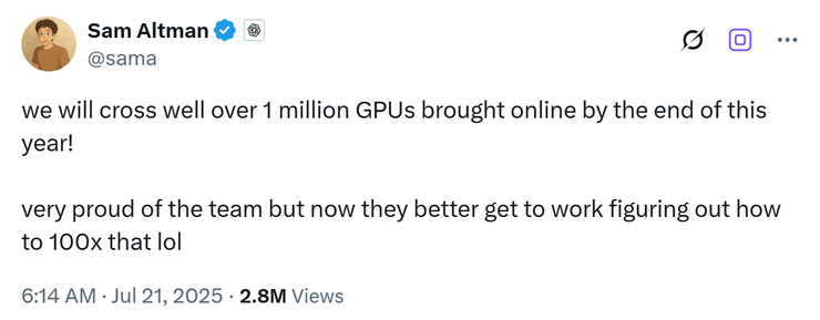 在算力基建上,OpenAI 也在加码。它正在推进代号 “Stargate” 的超级数据中心项目,投入规模据说可能高达数百亿美元。奥特曼甚至放话,到 2025 年底,OpenAI 拥有的 GPU 数量将突破 100 万台。
