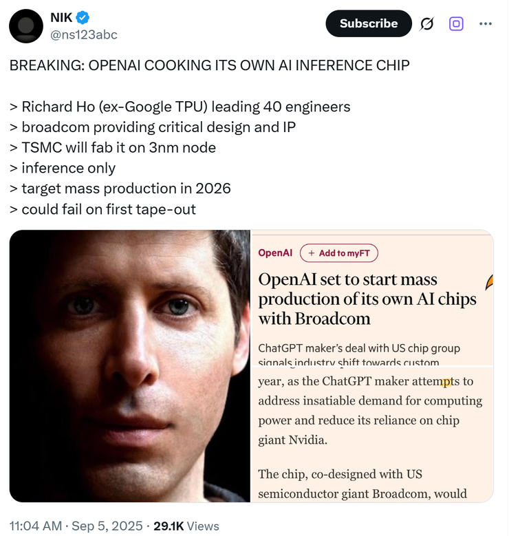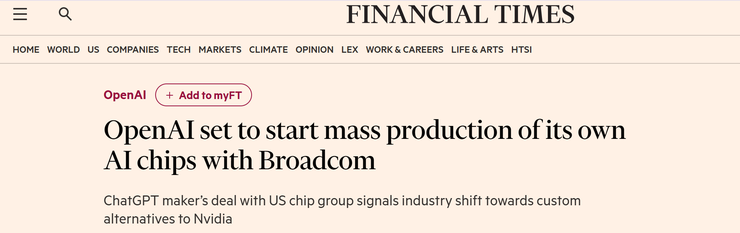 《金融时报》最新消息,OpenAI 正在和博通合作,自研一颗代号 “XPU” 的 AI 推理芯片,预计会在 2026 年量产,由台积电代工。不同于英伟达 的 GPU,这款芯片不会对外销售,而是专门满足 OpenAI 内部的训练与推理需求,用来支撑即将上线的 GPT-5 等更庞大的模型。