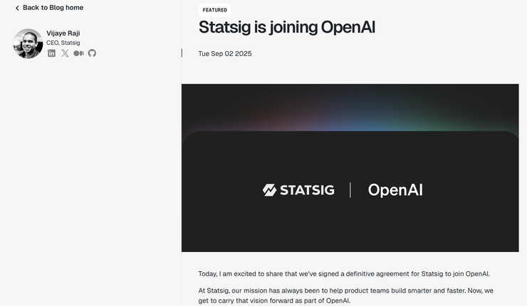 再看应用。 就在前几天,OpenAI 又出手收购了一家做产品测试和实验平台的公司 Statsig,交易金额在 11 亿美元左右,是 OpenAI 迄今最大规模的收购之一。而 Statsig 的强项是做 A/B 测试和功能实验,能帮助工程团队快速迭代产品。