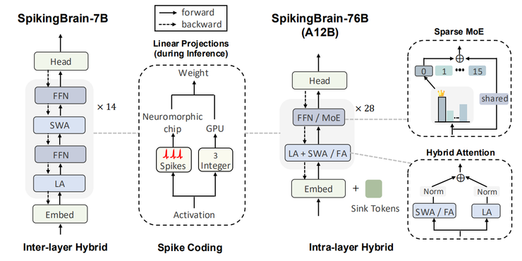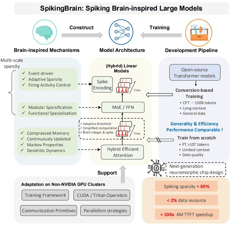 直到最近,中科院团队抛出了一篇新论文,提出了一个全新系列的类脑大模型 SpikingBrain。他们通过引入 spiking 神经元、线性注意力和稀疏专家机制,不仅在超长文本处理上实现了 百倍加速,还首次在 国产 GPU 平台 MetaX 上稳定训练出 76B 规模的模型。