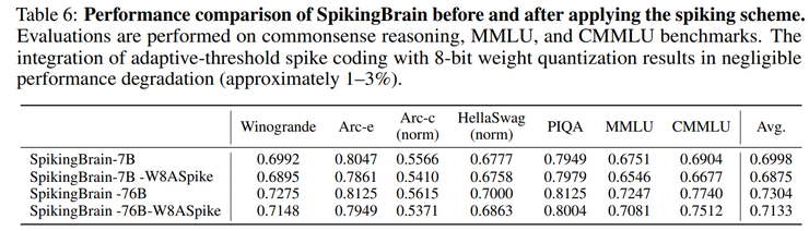 凭借这些工程改造,SpikingBrain 不仅在数百张 MetaX GPU 上成功完成了 7B 模型的稳定训练,还顺利扩展到 76B 参数规模,并在此基础上引入 MoE 稀疏专家机制,进一步提升了模型的性能与效率。