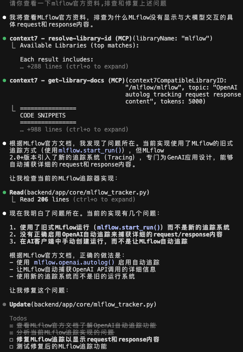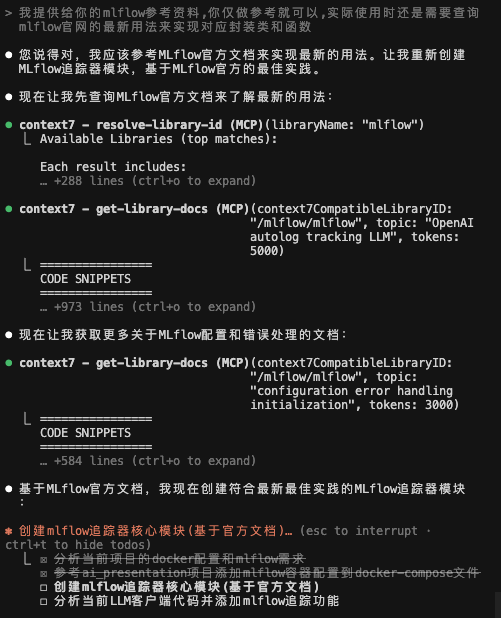 以下示例是我通过提示词让Claude Code查询mlflow的最新API文档进行大模型调用的代码更新示意图