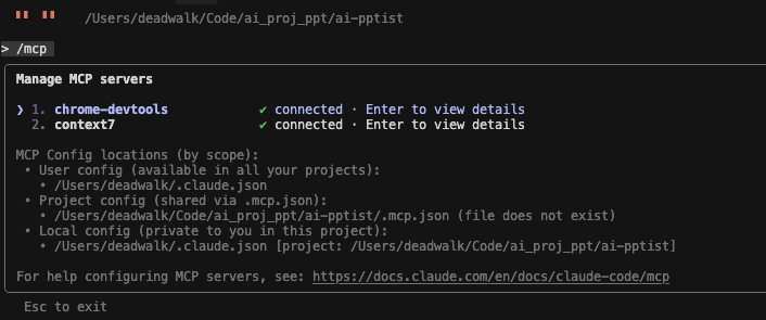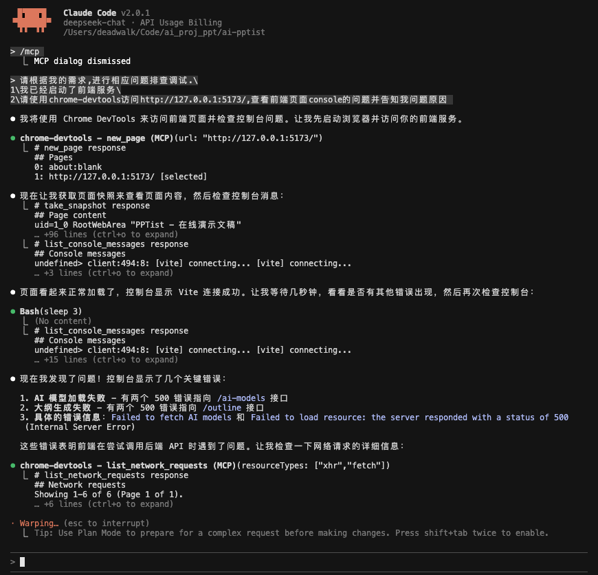 启动claude之后,通过/mcp命令,确认chrome-devtools工具可用