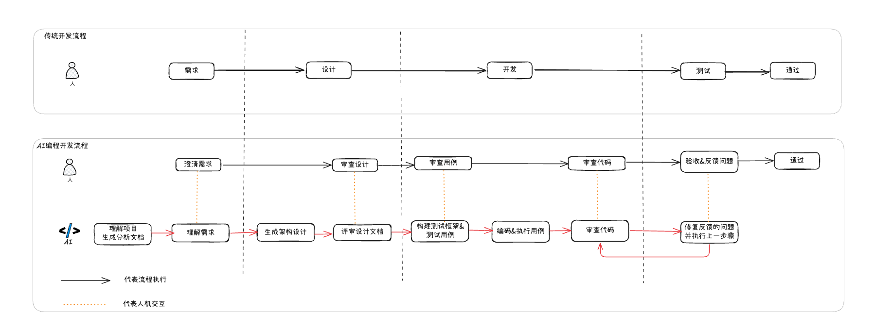 上图是一个 传统开发流程 与 使用AI编程工具的人机协作流程 对比。相比较传统开发流程会有一些不同之处: