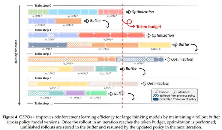 C3PO++ 专注于提升长序列推理和大规模 rollout 的效率。该方法采用动态分区和 token 预算机制,将推理过程划分为多个小批次,并利用持久化缓冲区续传未完成任务,有效提升 GPU 利用率和整体训练吞吐量。
