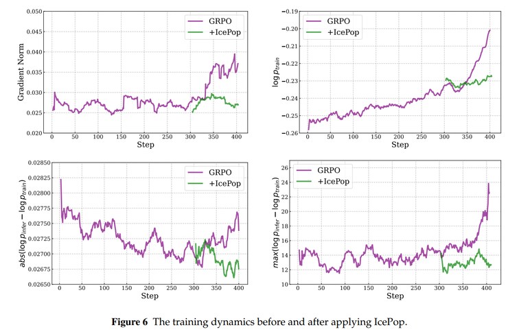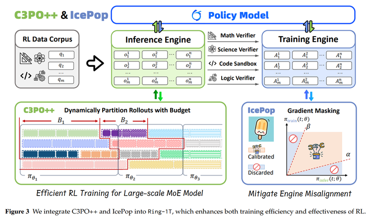 在强化学习阶段,Ring-1T 的性能提升主要依赖两项关键技术:IcePop 和 C3PO++。其中,IcePop 的目标是让训练过程更加稳定,避免模型在训练和推理阶段出现表现不一致的情况。