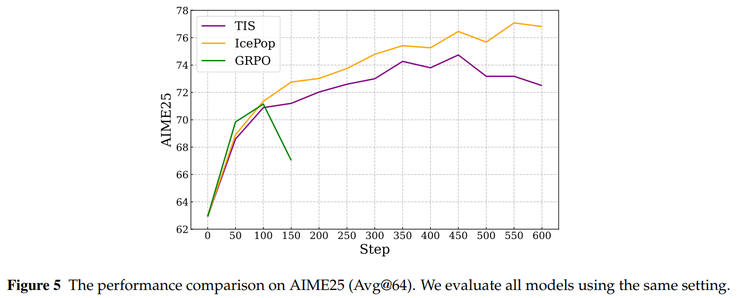 总体来说,IcePop 让训练更稳,C3PO++ 让训练更快,两者结合,使 Ring-1T 能在万亿参数规模下保持高效、稳定的强化学习表现。