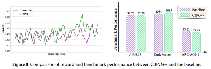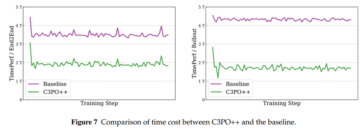 而之后的 C3PO++ 则负责优化 rollout 过程,使训练在大规模分布式环境下更加高效,特别是在处理超长序列时。传统方法在遇到很长的推理样本时会拖慢整个训练进程,而 C3PO++ 通过“分段训练”和“并行续传”的方式解决了这个问题。
