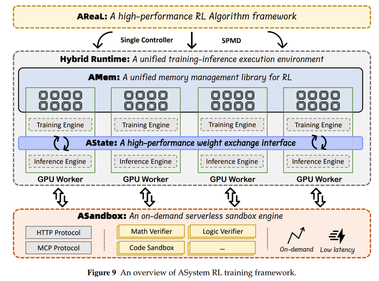 而 ASystem 则是支撑万亿参数强化学习的分布式架构。它整合统一的训练与推理运行时、高效的显存管理、快速的参数同步以及安全的隔离执行环境,使大规模模型训练具备更高的并行性、稳定性与容错性。