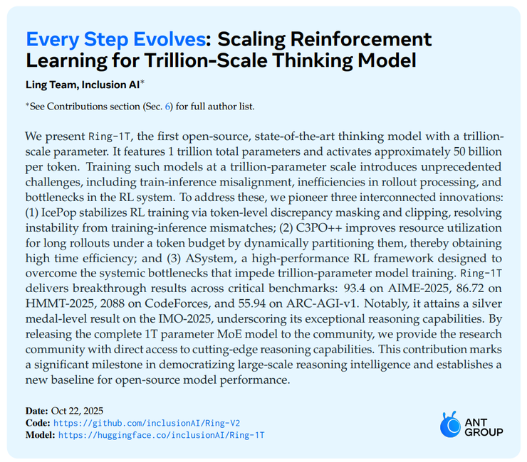 过去的模型大多依赖数据去模仿人类答案,但面对复杂推理或逻辑问题时容易出错。Ring-1T 的研究探索了一种新的思路 —— 通过强化学习让模型在反馈中不断调整自己的思考方式,逐步形成更稳定、更清晰的推理能力。