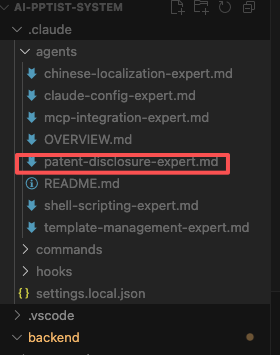 安装成功之后,脚本会在当前工程目录下创建一个 .claude 的目录,该目录下包含相关的配置以及Agent文件,下图中红框内的文件即为本次介绍的技术交底书生成Agent文件。
