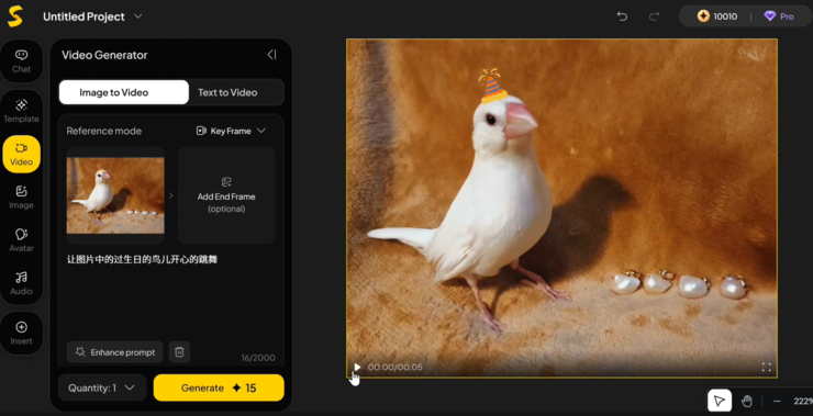 当我们在画布中加入一张静态图片并让它动起来时,生成的效果出乎意料地生动。画面中的主体在落脚处出现了轻微的下压与形变,连脚下柔软垫子的塌陷感都被自然捕捉。