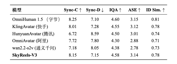 此外,系统支持相机运动参数的监督学习,可在同一时间组合多种运镜,也能在不同时间实现平滑切换。关键帧插帧范式的加入,使其能在分钟级时长内保持高质量嘴部对齐与动作一致性。在官方评测中,模型在嘴部同步、视频质量(IQA 4.58)与角色一致性(ID 0.78)等指标上均达到闭源 SOTA 水平。